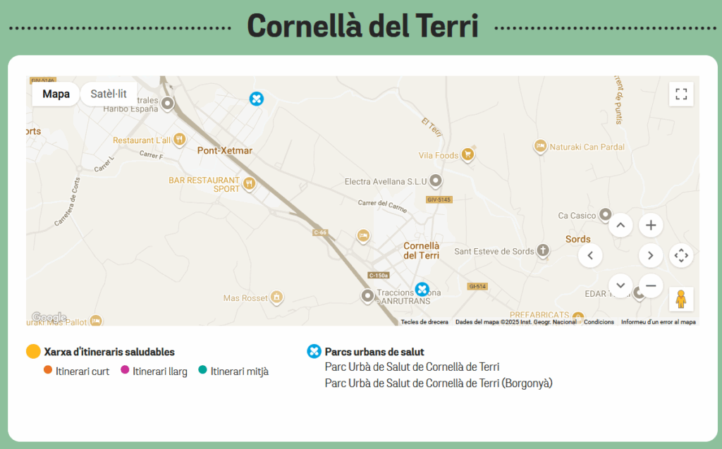 El poble de Cornellà del Terri ja té instal·lat l’itinerari saludable i esportiu i el parc de salut perquè els vilatans puguin gaudir d’un gran gimnàs per totes les edats a l’aire lliure distribuït al llarg del carril bici i a la plaça de Borgonyà, a on hi han els aparells.
